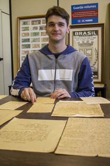 O estudante Guilherme Fröhlich, no Cedoc, com várias cartas