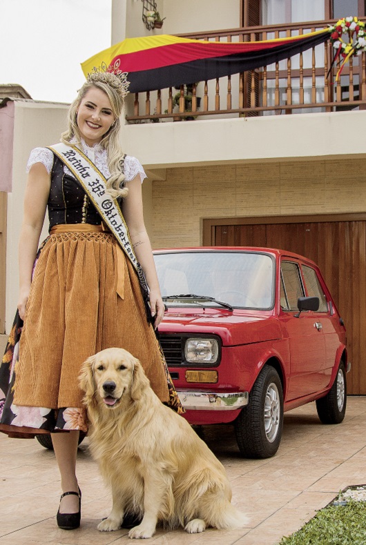 E se o evento será diferenciado, devido à pandemia, a soberana também é. A jovem coleciona títulos: Rainha do Colégio Ernesto Alves (2016), Garota Simpatia do Núcleo de Preparação dos Oficiais da Reserva (2018), 2ª Prenda do Centro de Tradições Gaúchas Lanceiros de Santa Cruz do Sul… Até sua carruagem real, um Fiat 147 todo reformado, se evidencia: foi o Carro Destaque em exposição de veículos antigos. Outra paixão, a Pepe, diminuição do nome Pérola, da cachorrinha Golden Retriever, faz questão de mostrar à tutora que está feliz. Assim que se aproxima, faz questão de dar aquele abraço carinhoso e pouco delicado.