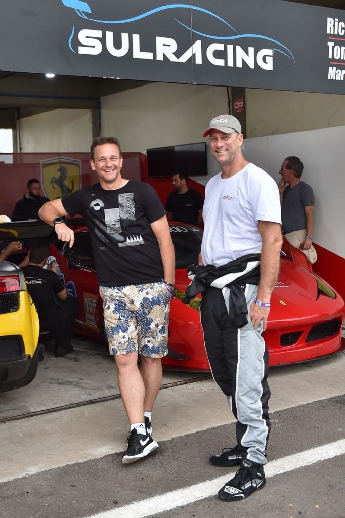 Encontrei pelo autódromo meu grande amigo Arthur Caleffi (à direita, na foto) e o também piloto Rodrigo Lemke, da categoria GT3 Light, equipe FTR Motorsport, que dividem uma Lamborghini, rasgando pelos boxes. Caleffi demonstra imensa satisfação em estar correndo novamente em Santa Cruz, depois de um bom tempo sem ter disputado provas por aqui.