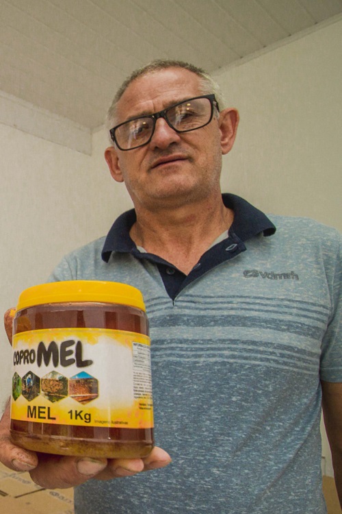 O clima também agiu em favor dos criadores de abelhas. “Esse ano tivemos chuvas regulares, então as plantas ficaram verdes e a colheita do mel foi bem acima das expectativas. Para nós, foi um ano até atípico, para comemorar”, conta o apicultor. Atualmente, são 29 cooperados e o mel puro produzido pela Copromel é repassado na região. O objetivo é expandir os negócios e passar a comercializar nacionalmente. “Nossa inspeção nos permite vender mel para todo o Brasil”, salienta o presidente.