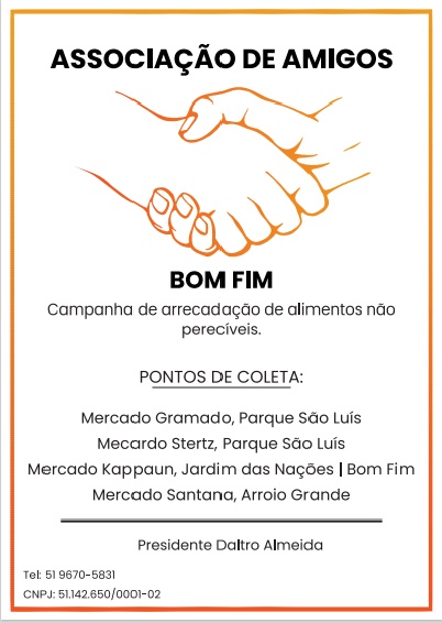 A Associação dos Amigos do Bonfim (Aamibomfim) está realizando uma ação para arrecadar alimentos não perecíveis e agasalhos para as pessoas que foram afetadas pelas enchentes. Conforme explicou o presidente da associação, Daltro Almeida, alguns mercados estão participando como ajudantes da iniciativa. A abertura da campanha de doações começou com a arrecadação no Via Atacadista, onde houve uma grande concentração de alimentos arrecadados.