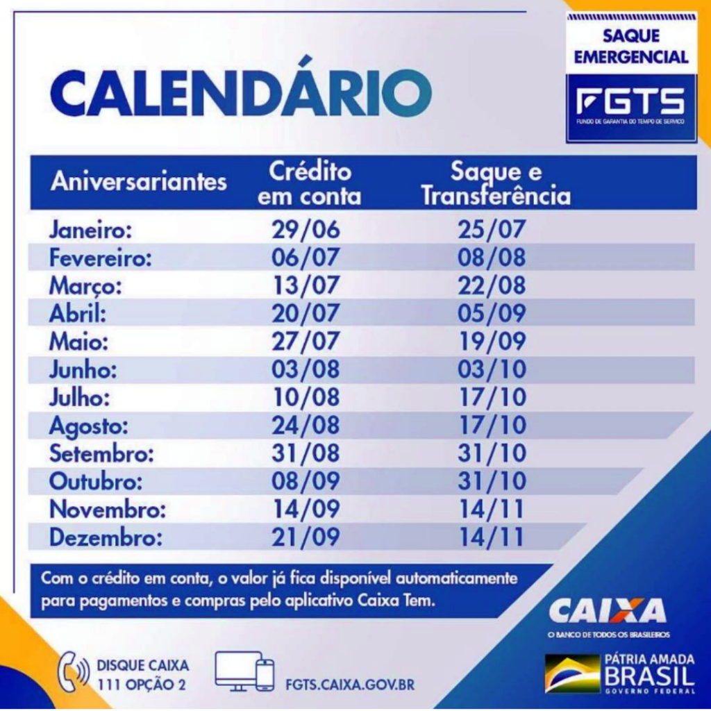 O calendário foi estabelecido com base no mês de nascimento do trabalhador e contém a data que corresponde ao crédito dos valores na conta poupança social digital, quando os recursos poderão ser utilizados em transações eletrônicas, além da data a partir de quando os recursos estarão disponíveis para saque em espécie ou transferência para outras contas.