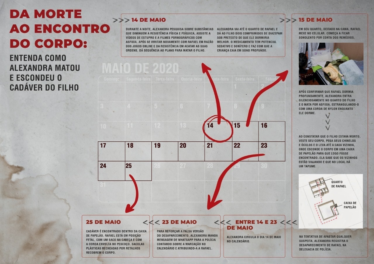 - 14 de maio – Durante a noite, Alexandra pesquisou sobre substâncias que diminuem a resistência física e psíquica, assistiu a vídeos de estupro e a filmes pornográficos com asfixia. Após se irritar novamente com Rafael em razão dos jogos online e da resistência em acatar as ordens dadas por ela, deu sequência ao plano para matar o filho. Alexandra foi até o quarto de Rafael e deu ao filho dois comprimidos de Diazepam sob pretexto de que ele dormiria melhor.
