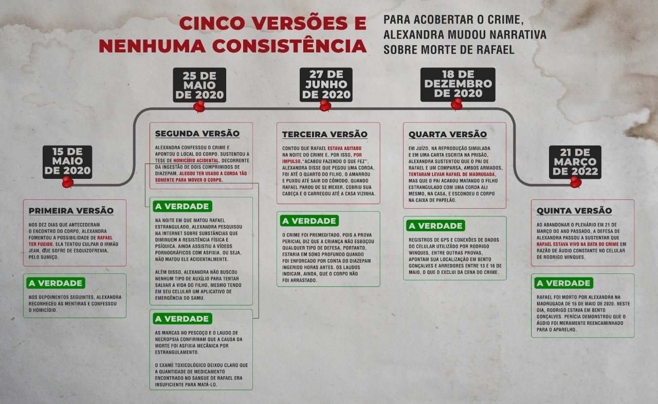 - Terceira versão – Contou que Rafael estava agitado na noite do crime e, por isso, por impulso, “acabou fazendo o que fez”. Alexandra disse que pegou uma corda, foi até o quarto do filho, o amarrou e puxou até sair do cômodo. Quando Rafael parou de se mexer, cobriu a cabeça dele e o carregou até a casa vizinha.