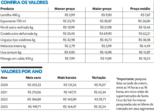 Pesquisar preços é uma das dicas mais comuns para economizar na hora de fazer as compras, mas tratando-se da ceia de Ano-Novo, a orientação vale ainda mais e pode garantir um alívio expressivo para o bolso do consumidor. Na tarde dessa quarta-feira, 27, a Gazeta do Sul percorreu cinco redes de supermercados do município e pesquisou o preço de oito itens tradicionalmente usados na ocasião. São eles: lentilha, pernil suíno, linguiça tipo calabresa, costela suína defumada, melancia, uva comum, pêssego em calda e espumante.