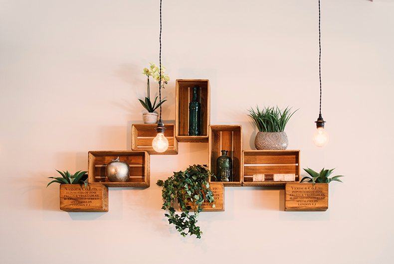 Os caixotes de madeira podem dar um charme ao ambiente, especialmente se combinados com plantinhas e outros itens.