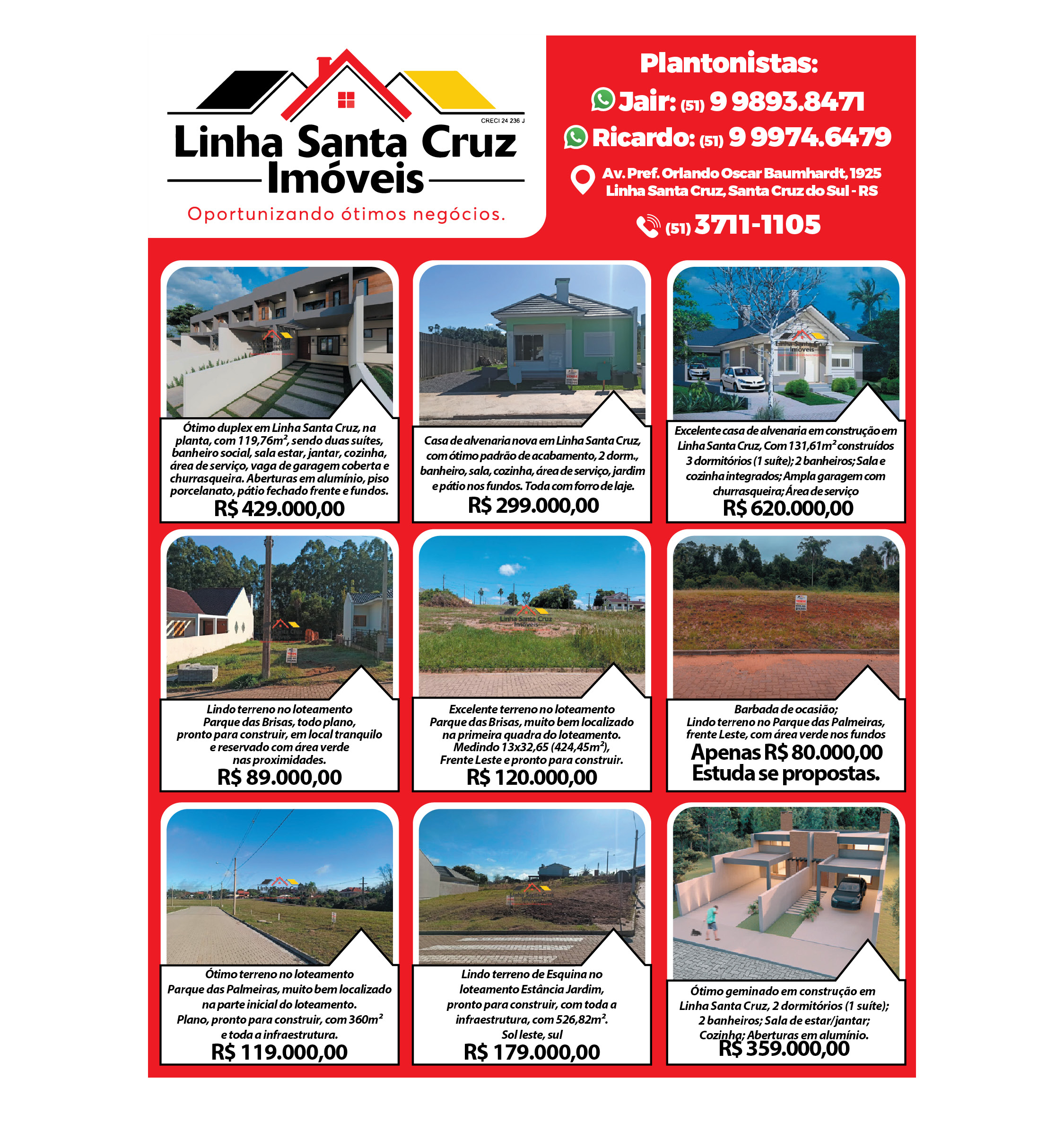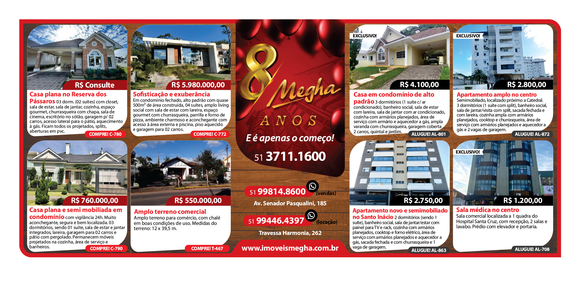 O suplemento de Classificados, que circula nas edições de terças, quintas e sábados, é um dos mais tradicionais da Gazeta do Sul, como vitrine e canal de negócios, de oferta, compra e venda em toda a região central do Rio Grande do Sul. E, para enriquecer pesquisas de produtos e serviços e possibilitar resultado ainda melhor a usuários e parceiros, nos anúncios de clientes cadastrados, o leitor tem acesso direto com link ao site do anunciante, onde poderá verificar mais detalhes sobre os itens. Confira as ofertas: