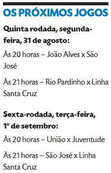 Nesta segunda-feira, a primeira partida, a partir das 20 horas, envolve João Alves e São José, seguidos de Rio Pardinho e Linha Santa Cruz, justamente os dois clubes que serão tema da matéria especial na Gazeta do Sul. Na terça-feira, é a vez de União x Juventude no primeiro jogo, e de São José x Linha Santa Cruz no segundo confronto.