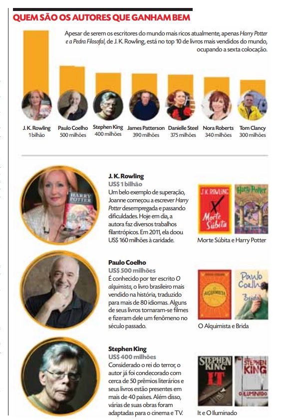 Com a saga Harry Potter, a escritora britânica J. K. Rowling, 54 anos, tem uma fortuna que é o dobro do seu segundo colocado, um brasileiro, o Paulo Coelho. Seus livros ganharam popularidade mundial, recebendo múltiplos prêmios e vendendo algo em torno de 500 milhões de cópias, desde o seu primeiro volume, Harry Potter e a Pedra Filosofal, de 1997. De lá para cá, foram mais seis. O último, Harry Potter e as Relíquias da Morte, foi publicado em 2007. É a série literária mais vendida da história. A Warner Bros. adaptou as obras para o cinema, fazendo com que os filmes entrassem na lista das produções de maior bilheteria.