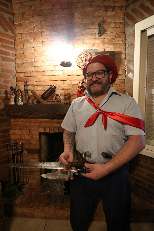 Eletricista de profissão e tradicionalista por paixão, Carlos nos conta que tudo se iniciou em 1998, quando recebeu de presente de aniversário uma faca de churrasco da marca Garantida. Desde então, tomou gosto pelo negócio e começou a colecionar. Hoje, 22 anos depois, possui em seu acervo um número considerável destas relíquias, de vários tipos e tamanhos. Uma das peças que nos chamou atenção foi uma faca em aço damasco, toda diferenciada, pois é feita com a fusão de várias camadas de aço. Sua lâmina tem de passar por várias temperas e o aço é forjado várias vezes.