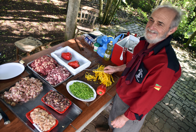 Mais ao fundo na propriedade, em um galpão aberto, membros do Garrão de Potro escutavam músicas tradicionalistas e, servidos de boas bebidas, acompanhavam a minuciosa produção de uma refeição que já se tornou clássica do CTG: a paella gaudéria do Joarez. “Vai carne de gado, porco, frango, coração, calabresa, tudo picadinho. Frita tudo e depois mistura. Na paellera vai cebola e alho, e trabalha como se fosse um carreteiro”, detalhou o homem para a Gazeta.