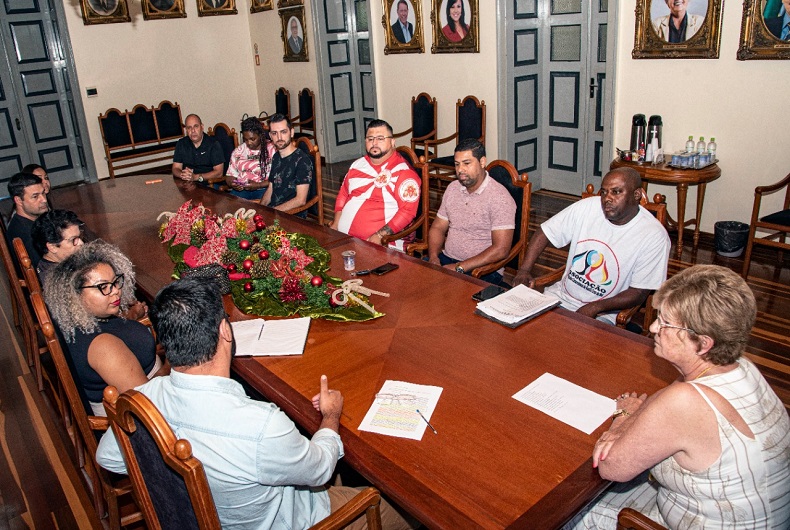 O Carnaval Santafolia 2023 será realizado na Marechal Floriano, principal rua do Centro de Santa Cruz do Sul, no dia 25 de fevereiro. Nesta quarta-feira, 14, a prefeita Helena Hermany e o secretário de Cultura, Marcelo Corá, receberam o presidente da Associação das Entidades Carnavalescas de Santa Cruz (AECSCS), Paulo Henrique Ipê da Silva, e representantes das escolas de samba no Salão Nobre do Palacinho acompanhados do vereador Cléber Pereira (União Brasil) e confirmaram a data.