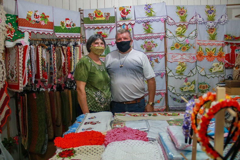 Os artesãos da ArteHaus, Egídio e Maria Overbeck, de Sinimbu, também comentam que o movimento está menor que nas outras edições. Segundo Maria, no primeiro dia de turno único, a circulação de pessoas já demonstrou melhora. O casal participa da Oktoberfest há mais de 15 anos. “Ele faz tricô, ajuda nas costuras porque eu sou costureira, é um trabalho em conjunto”. Produtos temáticos de Natal já estão expostos na banca da ArteHaus. “Sempre que viemos para a Oktober a gente já traz produtos de Natal, porque nessa época já começa a sair”.