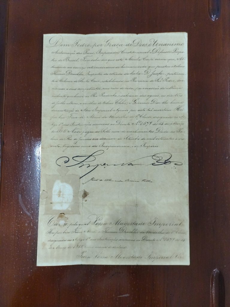 “Dom Pedro, por Graça de Deos, e Unanime Acclamação dos Povos, Imperador Constitucional e Defensor Perpetuo do Brasil. Faço saber aos que esta Minha Carta virem que, Attendendo aos serviços extraordiarios de humanidade que prestou o colono Thomaz Drachler, Inspector da estrada da Linha D. Josefa, pertencente à Colonia de Santa Cruz, estabelecida na Provincia de São Pedro, socorrendo a seus compatriotas, com risco de vida, por occasião da ultima enchente, que houve no Rio Pardinho, e salvando das aguas, no dia tres de Julho ultimo, a mulher do colono Ehlis; e Querendo Dar-lhe huma demonstração do Meu Imperial Agrado por acto tão meritorio, Hei por bem Fazer-lhe Mercê da Medalha de 1ª Classe.