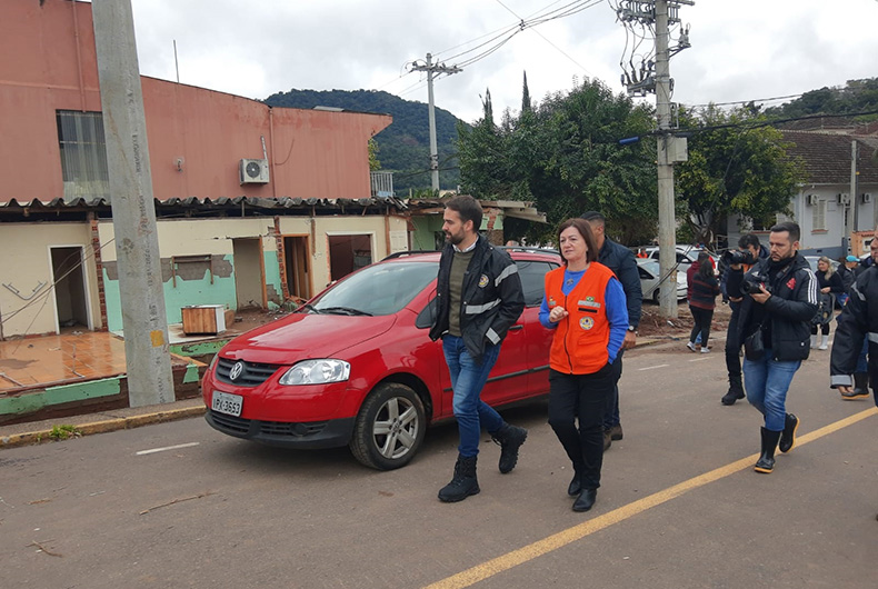 O governador Eduardo Leite esteve em Sinimbu na manhã deste sábado, 25. O chefe do Executivo gaúcho se reuniu com a prefeita do município Sandra Backes, além de ouvir demandas da comunidade e acompanhar o atendimento às famílias que tiveram danos por conta da destruição causada pelas águas do Rio Pardinho.