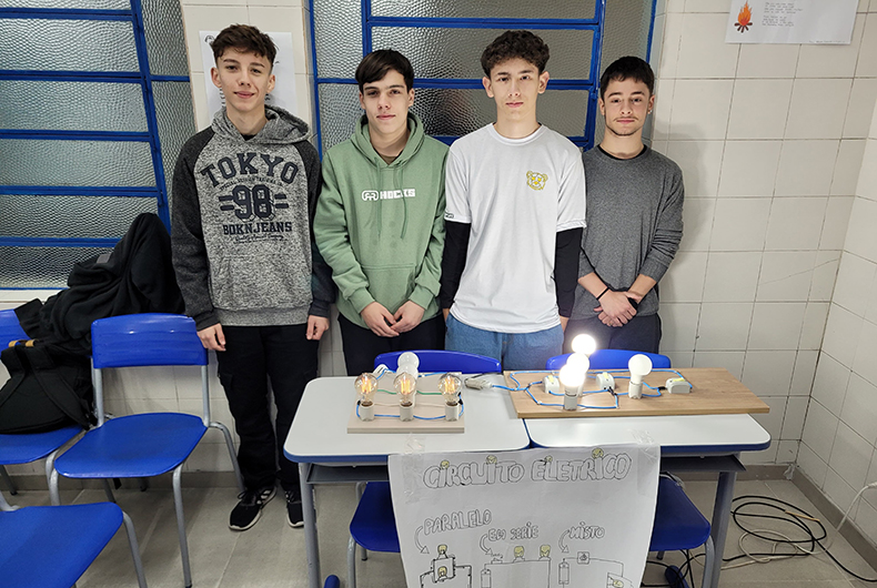Os alunos Vinícius Fontoura, Matheus Santos, José Gabriel Jacques e Luan Mello da Silva, do 9º ano, criaram um sistema elétrico misto e usaram lâmpadas para demonstrar a atuação dele. Além da sala de aula, as instruções para a montagem foram obtidas na internet. Para Vinícius, o conhecimento é importante para a vida cotidiana. “É interessante saber por que os problemas acontecem e não precisar de um eletricista para qualquer necessidade”, afirma. Ele não descarta ainda a possibilidade de buscar qualificação profissional nas áreas de elétrica ou eletrônica.