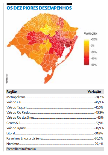 A Receita Estadual divulgou a primeira edição de um boletim econômico-tributário semanal sobre os impactos das enchentes nas movimentações econômicas dos contribuintes do Imposto Sobre Operações Relativas à Circulação de Mercadorias e Prestações de Serviços (ICMS). Quando é avaliado o volume de vendas nas indústrias por Conselho Regional de Desenvolvimento (Corede), o Vale do Rio Pardo contabiliza a quarta maior queda, ficando atrás da Região Metropolitana e Vales do Caí e Taquari. Somadas, essas regiões representam mais de 40% da participação do ICMS gaúcho.