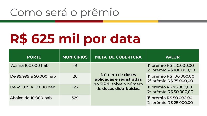 A proposta prevê R$ 1,25 milhão, divididos em duas datas: R$ 625 mil no dia 20 de julho e outros R$ 625 mil em 20 de agosto. A premiação será repassada aos municípios que, proporcionalmente, mais vacinarem, de acordo com o número de doses aplicadas e registradas no Sistema de Informações do Programa Nacional de Imunizações (SIPNI) sobre o número de doses distribuídas, em cada um dos quatro portes: acima 100 mil habitantes, de 99.999 a 50 mil habitantes, de 49.999 a 10 mil habitantes e abaixo de 10 mil habitantes.
