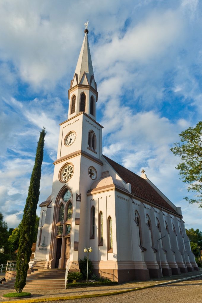 Wink – O arquiteto Simon Gramlich sempre optou por obras de grande impacto e esmero arquitetônico, mas sabia lidar muito bem com a questão da proporção. Para igrejas menores, a torre única ele considerava mais apropriado. Com torre única temos a sua primeira igreja construída no Brasil, em São Vendelino (RS), infelizmente derrubada no início dos anos 1980. Também a pequena igreja de Linha General Osório, interior de Monte Alverne, e a católica de Passo do Sobrado. Para as maiores, sempre optou por duas torres, como em Santa Cruz e Venâncio Aires. Em Santa Catarina, seguiu essa mesma regra, e quase todas as igrejas, projetadas e construídas, por serem de grandes dimensões, possuem duas torres.