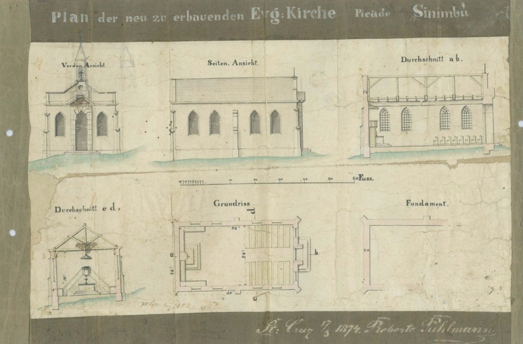 A aprovação da compra do terreno para a construção da nova igreja ocorreu em 2 de julho de 1938; estava situado no lado direito da extremidade norte da rua principal de Sinimbu. A partir de então, começaram os contatos para a escolha do projeto arquitetônico, com a definição do engenheiro-arquiteto Otto Hermann Menchen como autor. A proposta previa uma nave para 262 fiéis sentados, com o estilo historicista, ou seja, inspirado em uma mescla de elementos e correntes arquitetônicas do passado, entre elas o gó tico. Os membros da paróquia aprovaram a execução do trabalho por 73 votos a favor, com 58 manifestações contrárias.