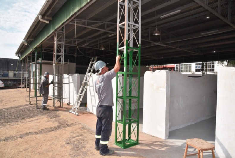 • Entre as intervenções já executadas, estão a colocação de piso de concreto, reforma do telhado mantendo o estilo colonial e instalação dos banheiros feminino, masculino e para deficientes físicos. Estão sendo erguidos os nove boxes que receberão os feirantes e seus produtos. Ainda faltam a reforma elétrica, pintura interna e colocação das esquadrias de ferro nas portas e janelas.