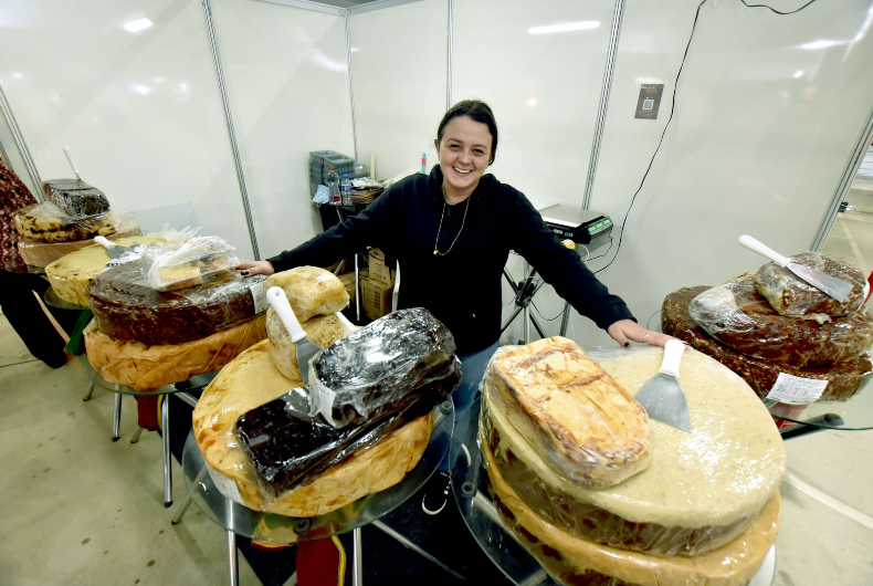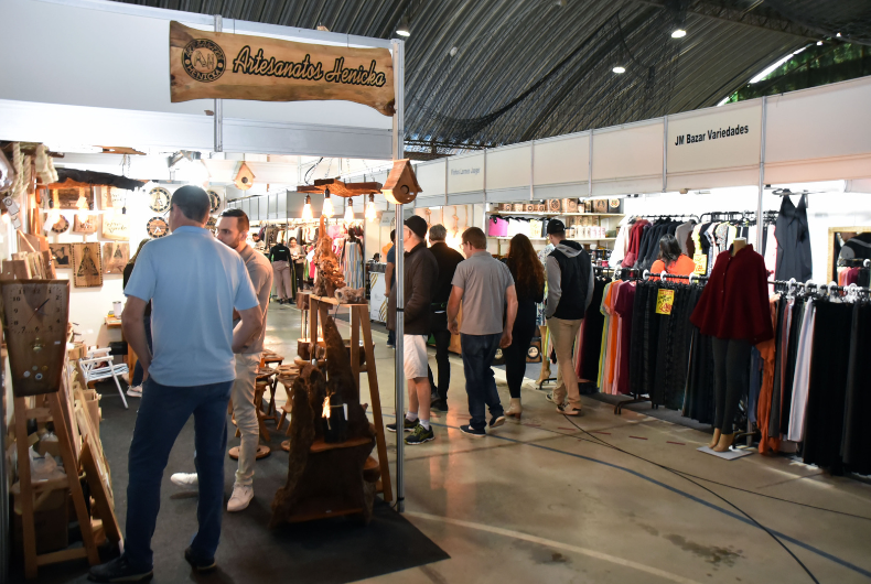 O espaço da feira comercial, no Ginásio de Exposições, conta com cerca de 60 expositores. Além de empresas do município, marcam presença lojistas de diversas regiões do Rio Grande do Sul e também de Santa Catarina e São Paulo. Entre eles está Tailine Ferreira, 25 anos, representante da franquia de doces artesanais Caravana do Marrocos, de Passo de Torres, em Santa Catarina. Com um estande abarrotado de cocadas, o espaço prende a atenção do público pelo tamanho dos doces (cada disco de cocada pesa 25 quilos). “Trouxe 400 quilos de cocada com frutas (abacaxi, damasco, maracujá e ameixa) e de cocada com chocolate (belga e italiano). Também tem a opção zero açúcar”, detalhou.