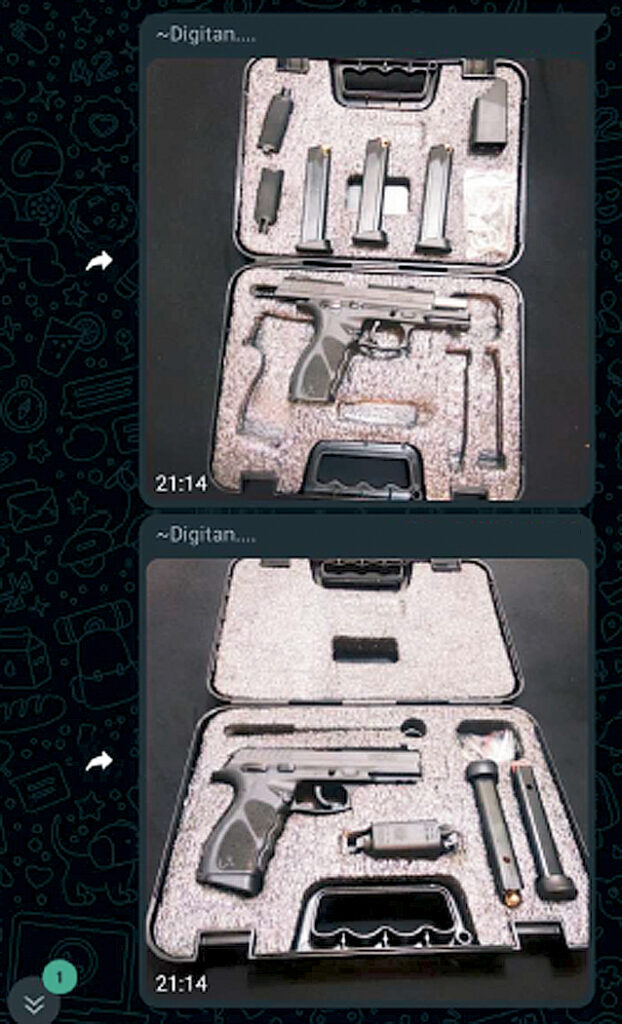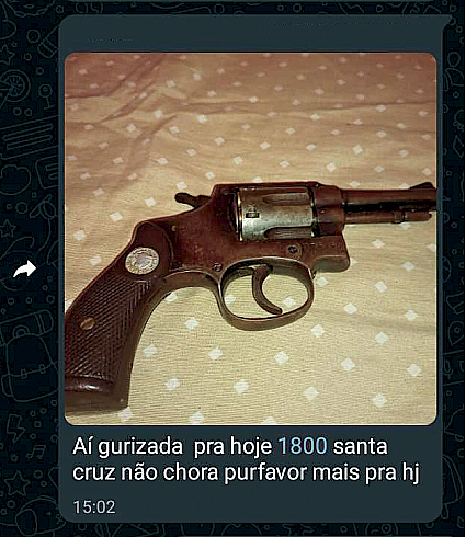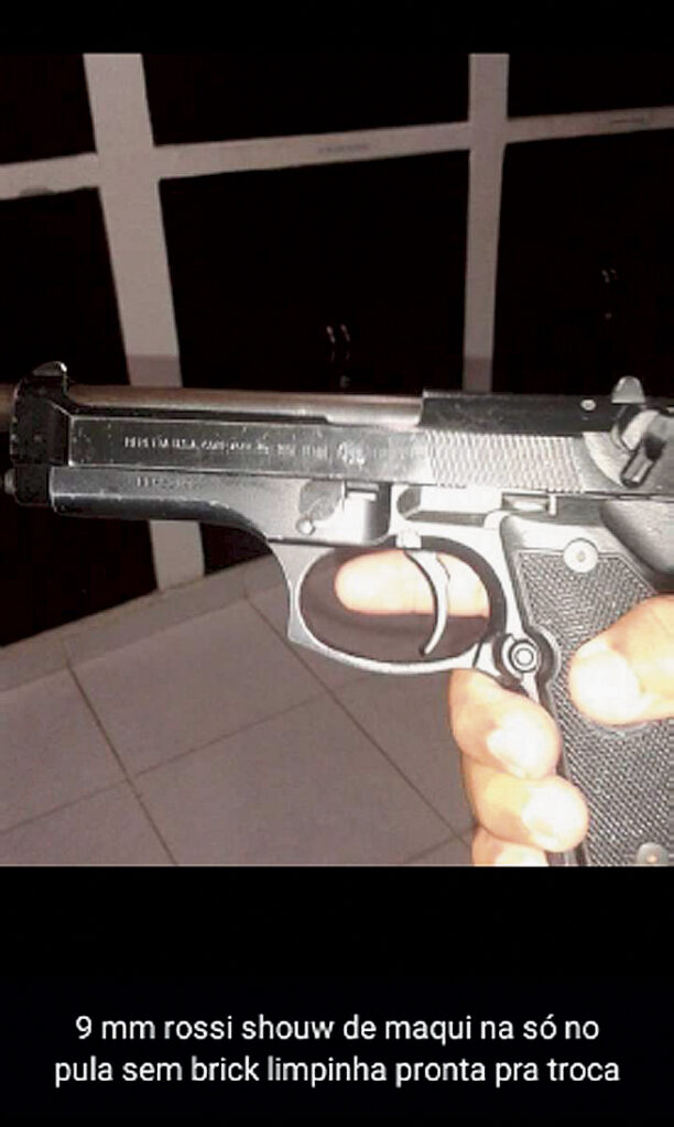 9 milímetros, marca Rossi. Show de máquina, limpinha. Só no ‘pila’, sem brique. Pyetra Colomb, 9 milímetros. Zero bala. Só no dinheiro. R$ 1 mil na mão já vai. Calibre 32. Boa de atirar.”