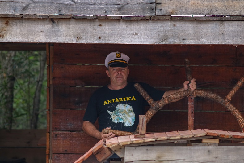A embarcação, construída totalmente em madeira, conta com todos os compartimentos de acordo com a planta original. Putzke acredita que é necessário voltar a usar mais madeira, que retém gás carbônico, responsável pela maior parte da poluição atmosférica. A produção do metal aplicado na indústria exige a queima de muito desse material. “A madeira equivalente ao navio precisa ser queimada para produzir uma cadeira de metal”.