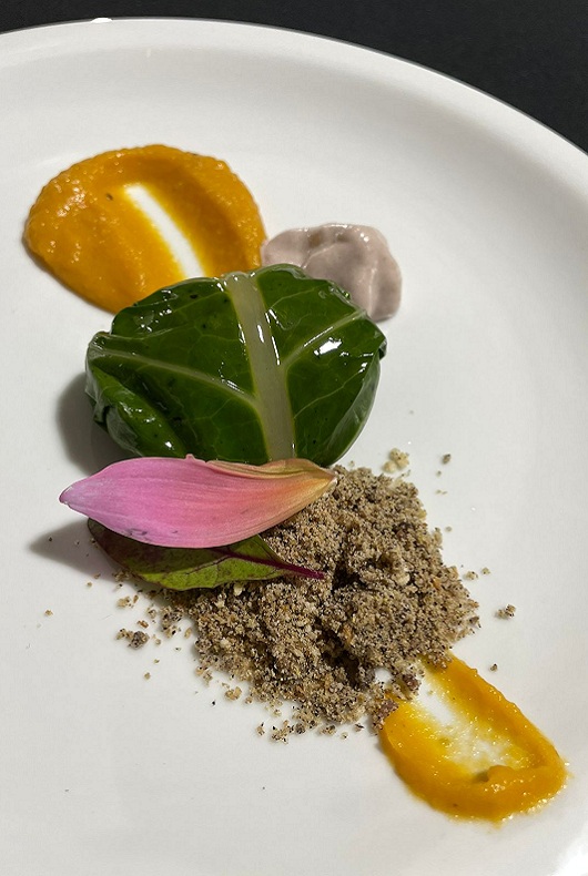 Ingredientes: ragu de cordeiro envolto na couve, mousseline de batata doce especial, espuma de queijo de vinho e farofa de milho crioulo. O prato emblemático foi pensado em conformidade aos itens que regiam o regulamento do concurso, sendo assim, ao entender que comida é linguagem e que a partir dela podemos contar e/ou rememorar histórias, a equipe apresentou um pouco das nuances sensoriais dos grupos identitários que foram se estabelecendo na fronteira Brasil-Uruguai.
