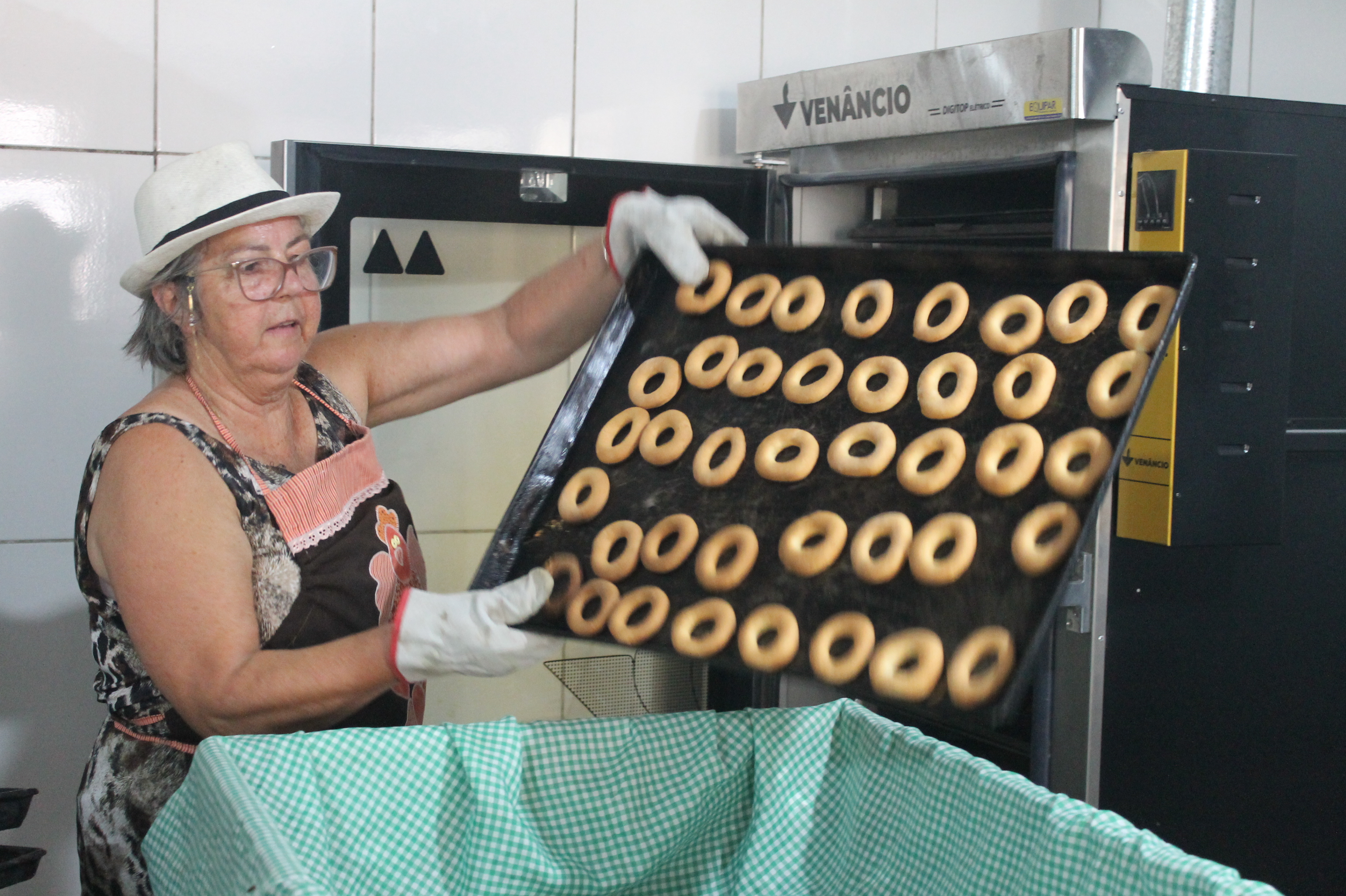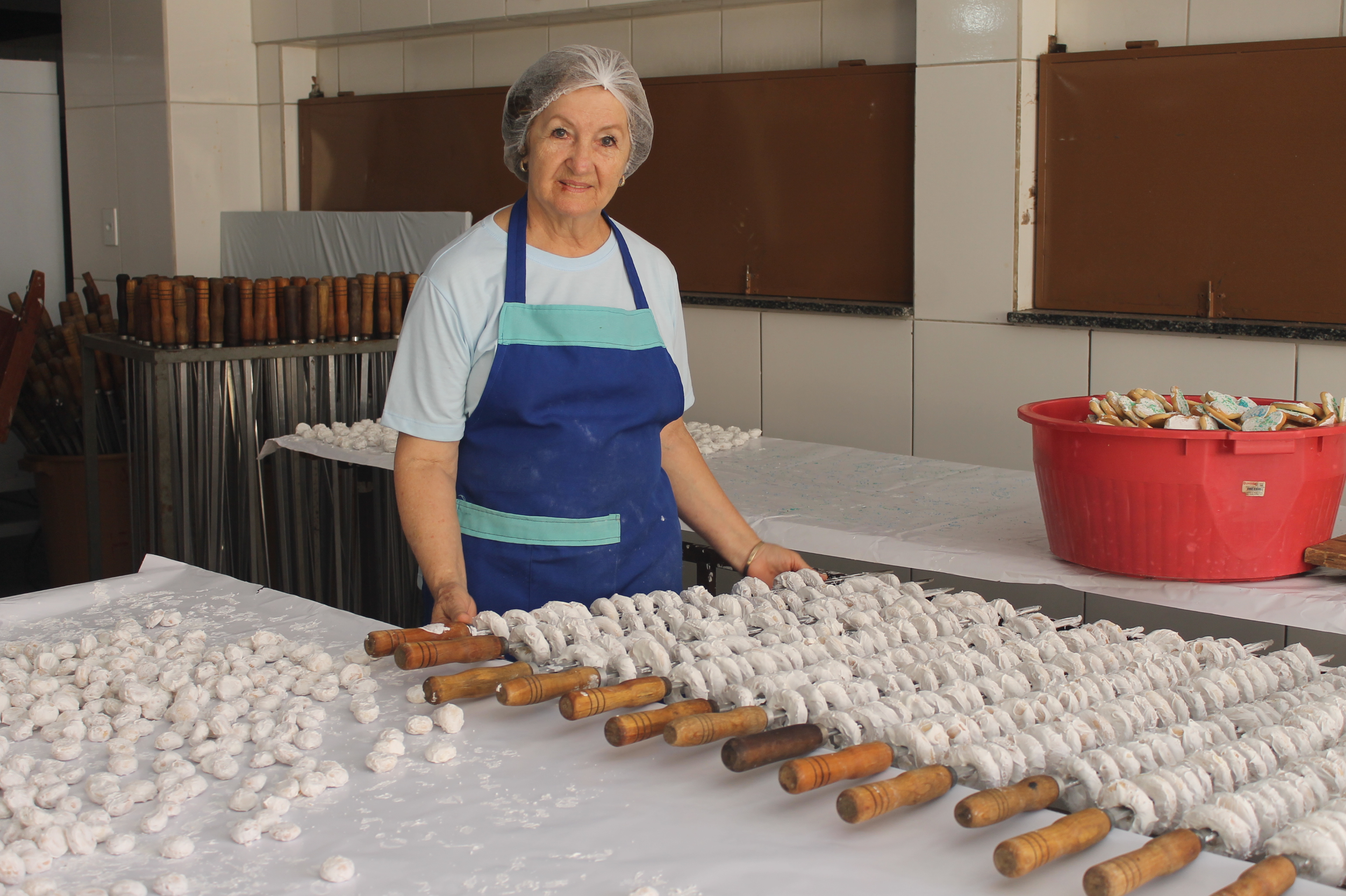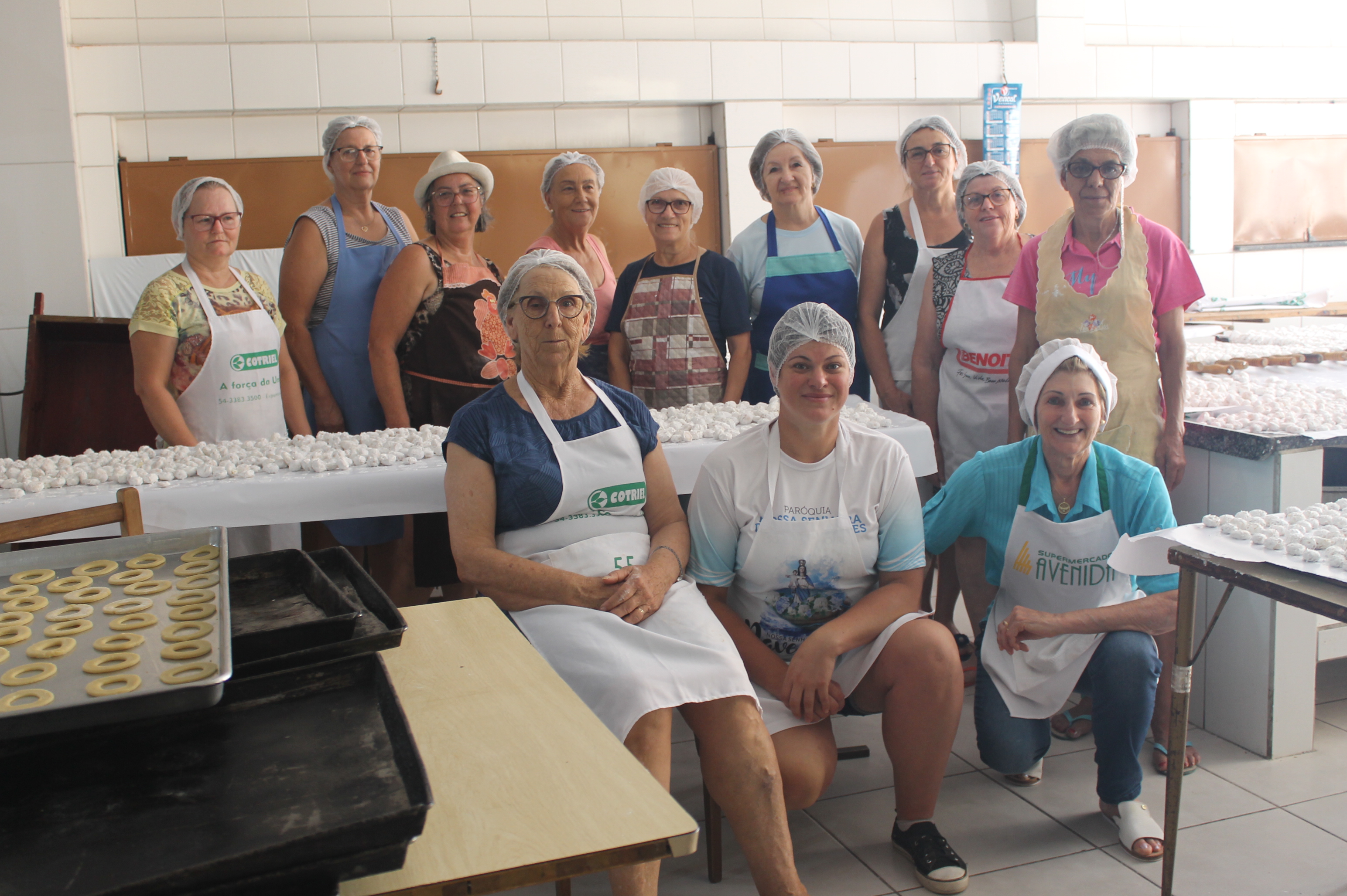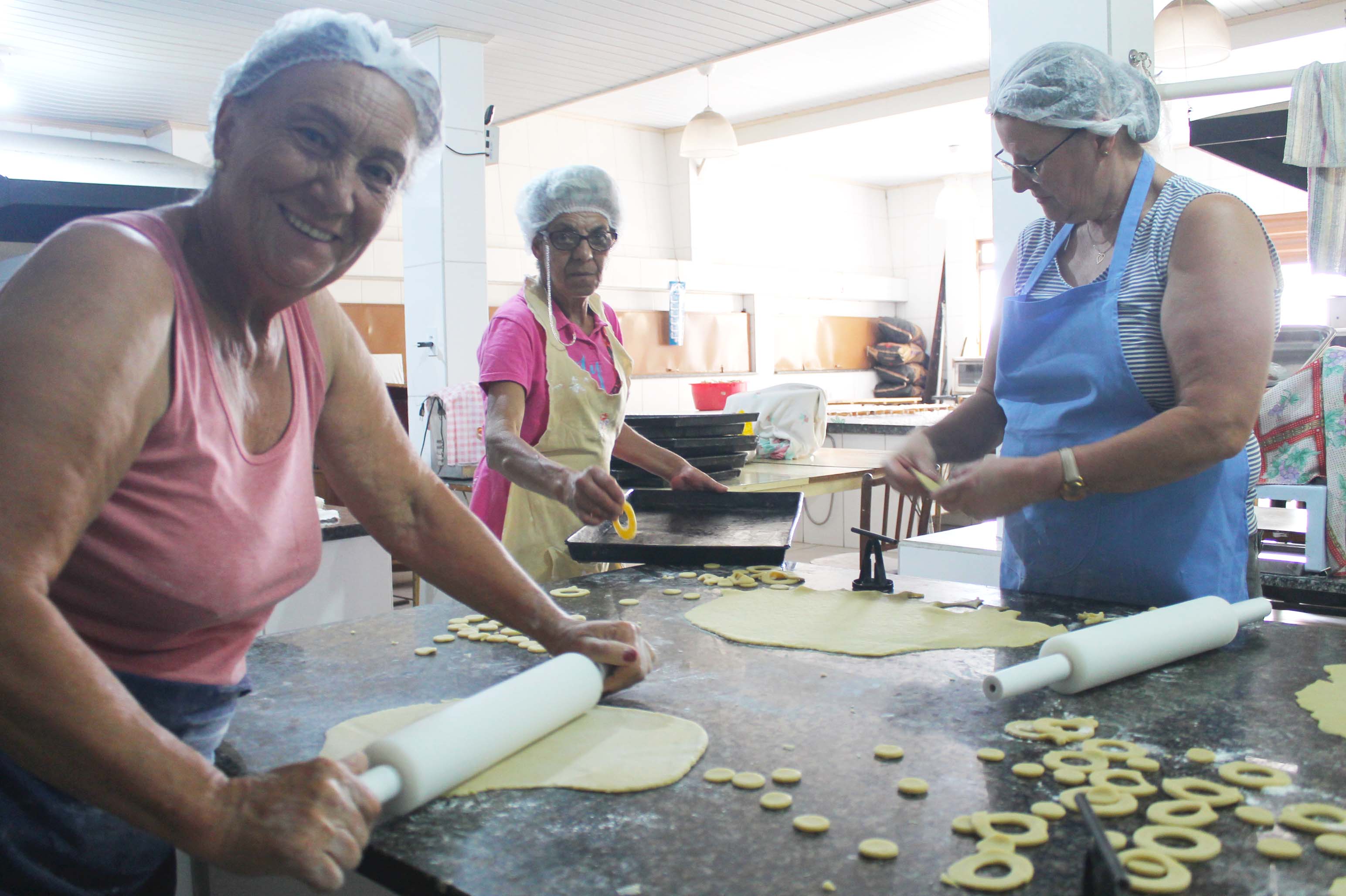 Diariamente, coordenadas por Renete Menegazzi, somam-se em muitas mãos para espichar e cortar a massa de cada receita, levando-as ao forno e depois glaceando parte delas. Conforme a voluntária, que há anos auxilia nesta produção, para esta edição foi feito um cronograma, onde as mulheres das diversas comunidades participam da atividade. Chegam a ser até 20 delas atuando em um único dia. “A média de idade das mulheres voluntárias é de 70 anos. Elas têm uma energia muito grande e a gente se alegra muito com o resultado. Temos todo o cuidado, pois aquilo que fazemos tem um consumidor final. Tudo o que fazemos aqui é resultado da nossa energia, com o verdadeiro intuito de colaborar, o que se reflete no produto”, salienta.