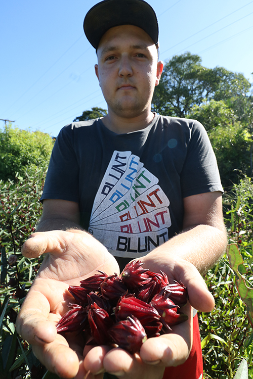 Em Linha Travessa, também em Santa Cruz do Sul, o jovem Fabrício Beckenkamp, de 23 anos, é outro produtor que se dedica ao hibisco. Ele afirma que a cultura ainda é uma experiência. Na área de cerca de três hectares onde cultiva verduras com seu pai, Fabrício plantou cerca de 40 pés e está no segundo ano de colheita. Ele planta o arbusto após a passagem do período mais frio do ano, já que o vegetal não lida muito bem com as baixas temperaturas e morre no inverno. “Ainda é uma cultura nova. Espero, no próximo ano, colher o dobro que estou colhendo neste ano”. Beckenkamp ressalta que em duas ou três semanas já poderá colher os cálices da planta mais desenvolvidos no pé. O período de falta de chuvas nos últimos meses foi um elemento que atrasou o desenvolvimento, mas a situação se normalizou com as últimas precipitações. “Quando estava dando seca, a planta estava bem sofrida”, relata o agricultor.