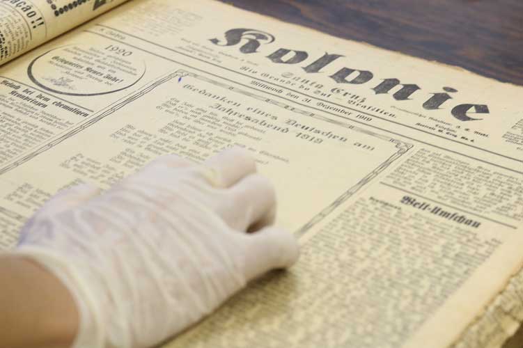 Com a ajuda da professora de língua alemã Cíntia Betina Pagel, a Gazeta do Sul visitou o acervo do Kolonie (foto) guardado pelo Centro de Documentação da Universidade de Santa Cruz do Sul (Unisc). No período de setembro de 1918 a janeiro de 1920, o jornal aborda de forma superficial o tema. Relatos de guerra e notícias vindas da Europa resumem o conteúdo.