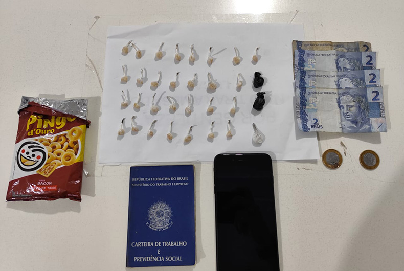 Durante o patrulhamento, os policiais militares localizaram o suspeito, que foi reconhecido como o mesmo homem preso anteriormente por tráfico de drogas. Foram encontrados em sua posse 32 pedras de crack e R$ 10,00 em dinheiro. Diante dos fatos, ele foi preso.