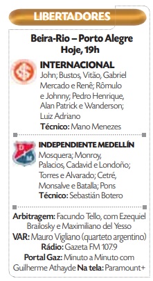 Dependendo de suas forças para avançar às oitavas de final da Copa Libertadores da América, o Internacional encara o Independiente Medellín, da Colômbia, a partir das 19 horas desta quarta-feira, 28, no Beira-Rio, pela sexta e última rodada da fase de classificação. O Colorado ocupa a segunda posição do Grupo B, e uma vitória por qualquer resultado garante o time em primeiro lugar da chave.
