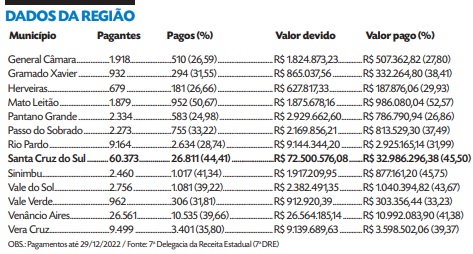 Os dados se assemelham à antecipação no ano passado, quando 45,12% dos proprietários de veículos fizeram o pagamento, com a arrecadação de R$ 28,4 milhões. Entre os municípios da região que fazem parte da área de abrangência da 7ª Delegacia da Receita Estadual (7ª DRE), apenas Mato Leitão teve índices melhores que Santa Cruz. Na Capital das Orquídeas, 50,67% dos contribuintes aproveitaram os descontos mais vantajosos para o pagamento do IPVA dos veículos, atingindo 52,57% da arrecadação total prevista com o tributo.
