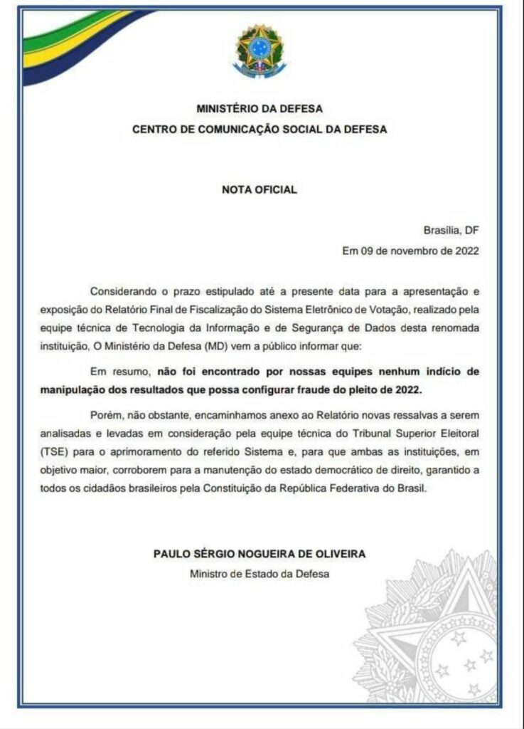 O Ministério da Defesa divulgou na manhã desta quinta-feira, 10, uma nova nota a respeito da fiscalização do sistema eletrônico de votação feita por militares. No posicionamento oficial, o órgão pontuou que a análise não excluiu a possibilidade de fraude ou inconsistência nas urnas eletrônicas nas eleições de 2022. O documento, porém, não apontou nenhuma irregularidade, como já havia sido destacado nessa quarta-feira, 9.