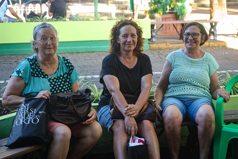 Em frente ao estabelecimento, três amigas – Sandra Kaufmann, Denise Fischer e Lúcia Fischer Hinterholz – se acomodaram em um dos bancos na calçada, aproveitando uma leve brisa que atravessava o túnel verde e se protegendo do sol na sombra das tipuanas. No fim das contas, apesar do clima severo, o dia foi muito bem aproveitado pelo grupo, que manteve o bom humor.
