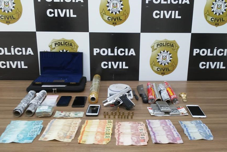 Na tentativa de encontrar o quarto suspeito, a polícia cumpriu três mandados de busca e apreensão desta quinta-feira no Bairro Santa Vitória, em residências onde o foragido poderia estar. Embora não tenha sido localizado, nas ações da 2ª DP, que contaram com o apoio de policiais da 1ª DP e da Delegacia de Repressão às Ações Criminosas Organizadas (Draco), dois homens foram presos. Houve a apreensão de uma arma, munições, facas, balanças de precisão, apetrechos relacionados ao tráfico e mais de R$ 7 mil em dinheiro ilícito.