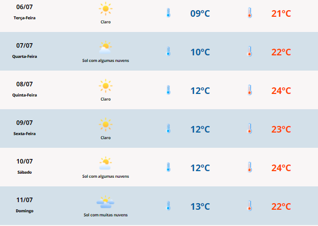 A quarta, 7, quinta, 8, e sexta, 9, serão semelhantes, com nevoeiro no amanhecer, madrugadas frias e um aumento gradativo da temperatura na parte da tarde. No entanto, as máximas na região não devem passar muito dos 22 graus.