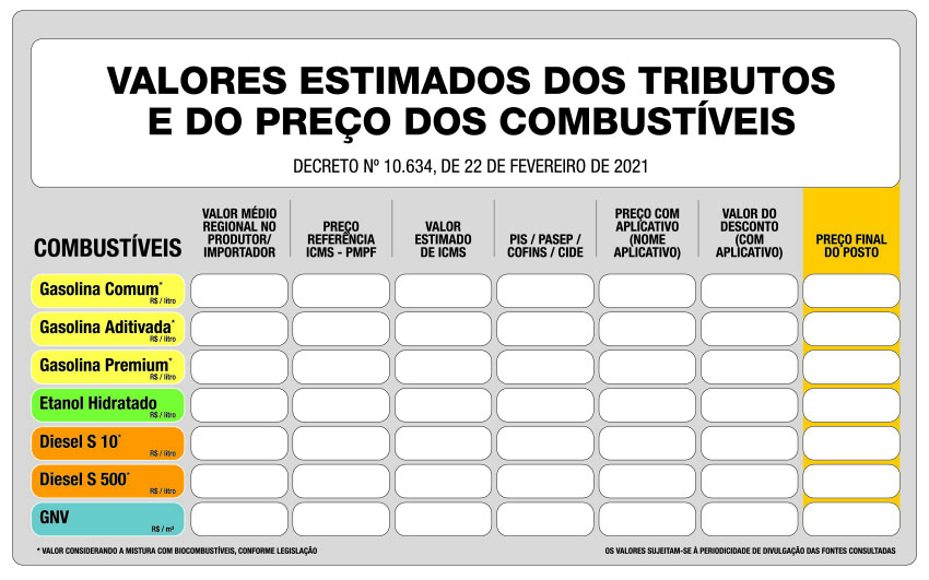 A outra novidade do decreto é a exigência de que os postos também informem, em painel afixado em lugar visível, sobre as estimativas de tributos cobrados sobre o produto. A informação deve conter o valor médio regional no produtor ou no importador; o preço de referência para o ICMS, que é um imposto estadual que incide sobre mercadorias e serviços, inclusive combustíveis; o valor do ICMS; o valor das contribuições para o PIS/Pasep e da Cofins, que são impostos federais incidentes sobre os combustíveis; e o valor da Cide, outra contribuição federal sobre a importação e a comercialização de petróleo, gás natural, derivados e álcool etílico combustível.