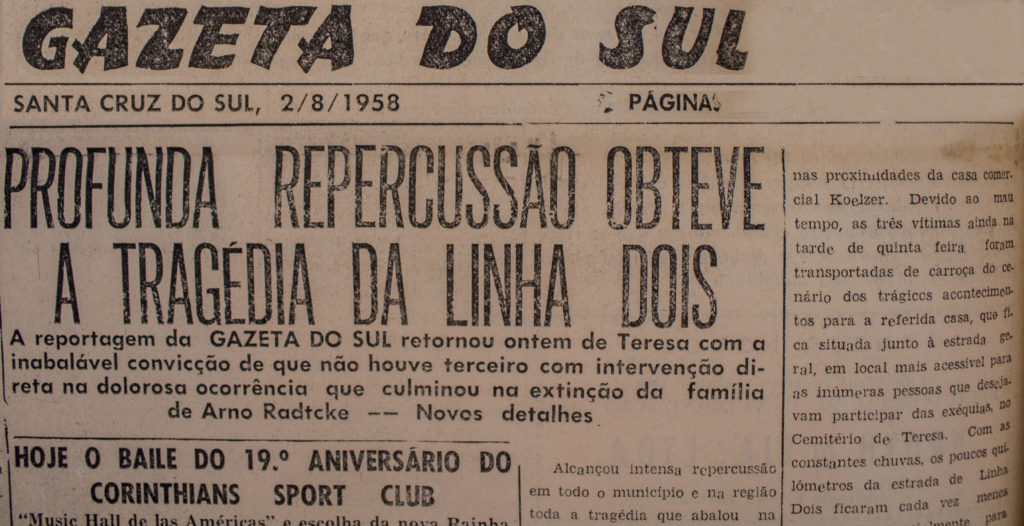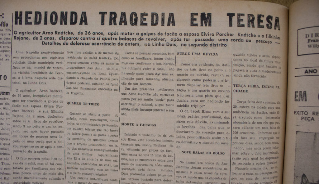 “Uma tragédia possivelmente sem precedentes nos registros policiais deste município verificou-se na manhã de ontem, na vizinha localidade de Vila Teresa, a cinco quilômetros daquela sede distrital, em Linha Dois. Por volta das 14h30, saiu desta cidade a caravana chefiada pelo delegado Carlos Simões Pires, acompanhado do inspetor Nuno Alves Guimarães e pelo representante desta folha, em um jeep gentilmente cedido pelo prefeito Dr. Arthur Walter Kaempf.