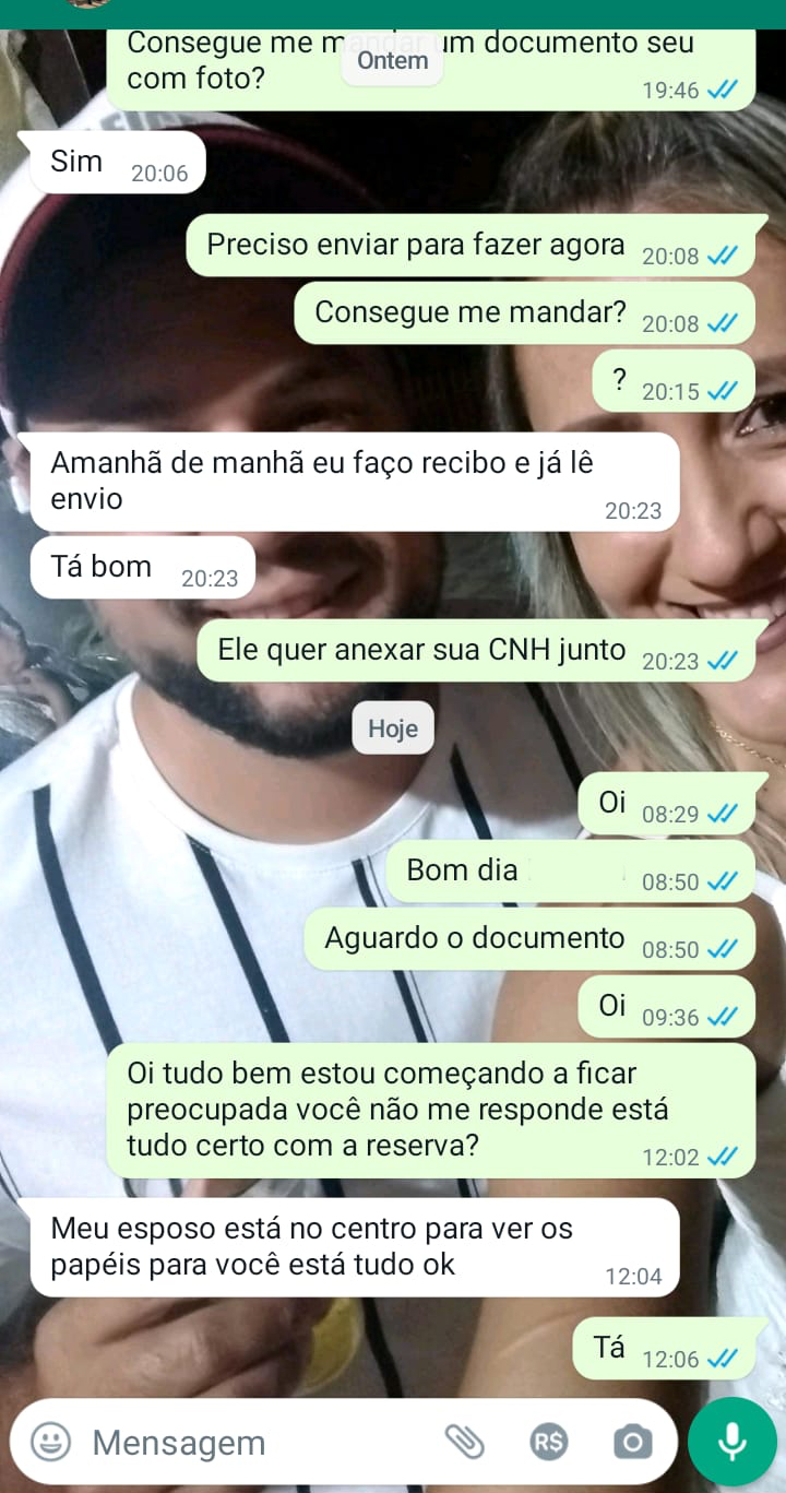 Para completar, Roger e Graziela passaram a divulgar as situações de golpe no grupo no Facebook, visando alertar as pessoas. O golpista viu e, rapidamente, alterou a foto no seu perfil no WhatsApp, para não relacionar com as postagens dos santa-cruzenses. Por fim, já nessa segunda-feira, o estelionatário colocou a foto do casal do Pedreira no perfil dele. “Uma amiga, que adicionou ele para confirmar o golpe, viu que estava usando a nossa foto.”