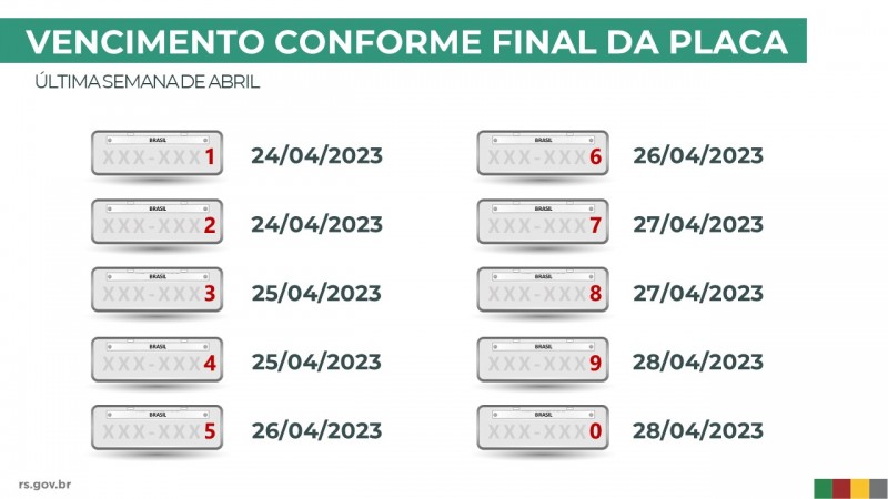 Quem não optar pela antecipação ou pelo parcelamento, deverá pagar o IPVA na data de vencimento da placa que se encerra em abril, conforme determinado na lei estadual. O vencimento em 2023 segue a seguinte ordem