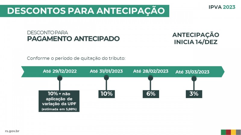 Quem quitar o tributo de 14 a 29 de dezembro terá desconto de antecipação de 10% e não incorrerá na variação da UPF/RS (que pelos índices inflacionários deve ficar em 5,88%), gerando redução potencial de 15,88%.