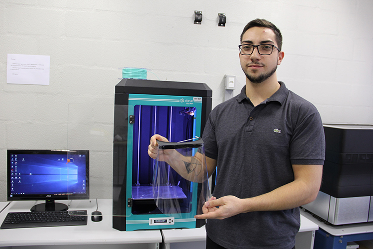 Ainda no ramo de EPI, está sendo projetada uma máscara protetora do modelo Face Schield, produzida por impressoras 3D disponíveis na universidade. O equipamento, constituído de filamento e lâmina de acetato, cobre todo o rosto dos profissionais de saúde, evitando o contagio por aerolização: “as Face Schield já são utilizadas em países da Europa e são uma solução interessante por oferecer maior segurança aos profissionais”, acrescentou João Pedro Tonetto, da Owntec.