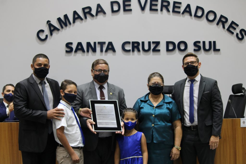 A Câmara de Vereadores realizou sessão solene na última quarta-feira, 2, para a entrega do título de Cidadão Santa-cruzense ao pastor Osvaldo Rodrigues, numa iniciativa do vereador Cléber Pereira (DEM).