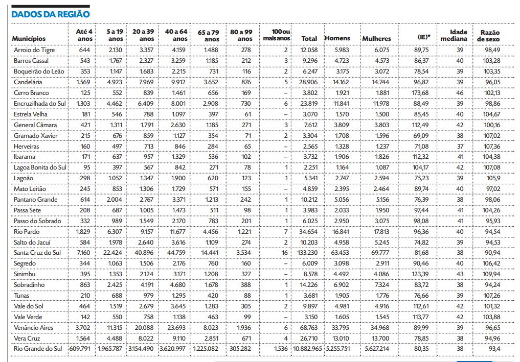 No Rio Grande do Sul, 14,1% dos moradores têm 65 anos ou mais. É o Estado com a maior proporção de população idosa. Na região, os municípios de Cerro Branco, Sinimbu e Vale Verde têm os índices mais altos de envelhecimento, enquanto Gramado Xavier, Herveiras e Salto do Jacuí, os mais baixos. O indicador representa o número de pessoas com 65 anos ou mais em relação a um grupo de 100 crianças de zero a 14 anos.