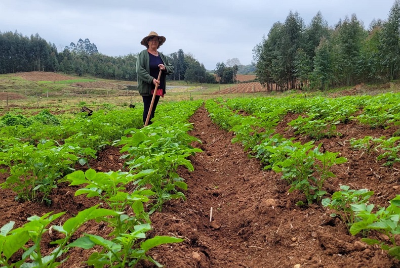 Neste período, além do tabaco, muitas outras culturas já estão nas lavouras. É o caso das batatinhas, caso das Jahres Kartofel, as batatinhas de ano, que minha mãe, dona Rosa, por tradição, planta por volta do dia de São João. Na foto abaixo, ela aparece em meio à tarefa da capina, e as plantas estão muito bonitas. O mesmo se vê com milho, feijão e outras hortaliças, que também já crescem viçosas.
