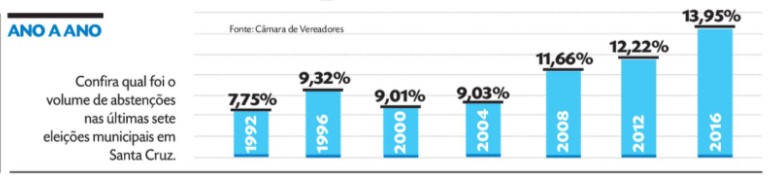 Segundo o estudo, que foi feito a partir de dados da Justiça Eleitoral, a eleição de 2016 registrou o menor comparecimento de eleitores dos últimos 30 anos em Santa Cruz. Na ocasião, a abstenção chegou a 13,95%. Das 99,9 mil pessoas que estavam aptas a votar para prefeito e vereador naquela ocasião, quase 14 mil não compareceram.
