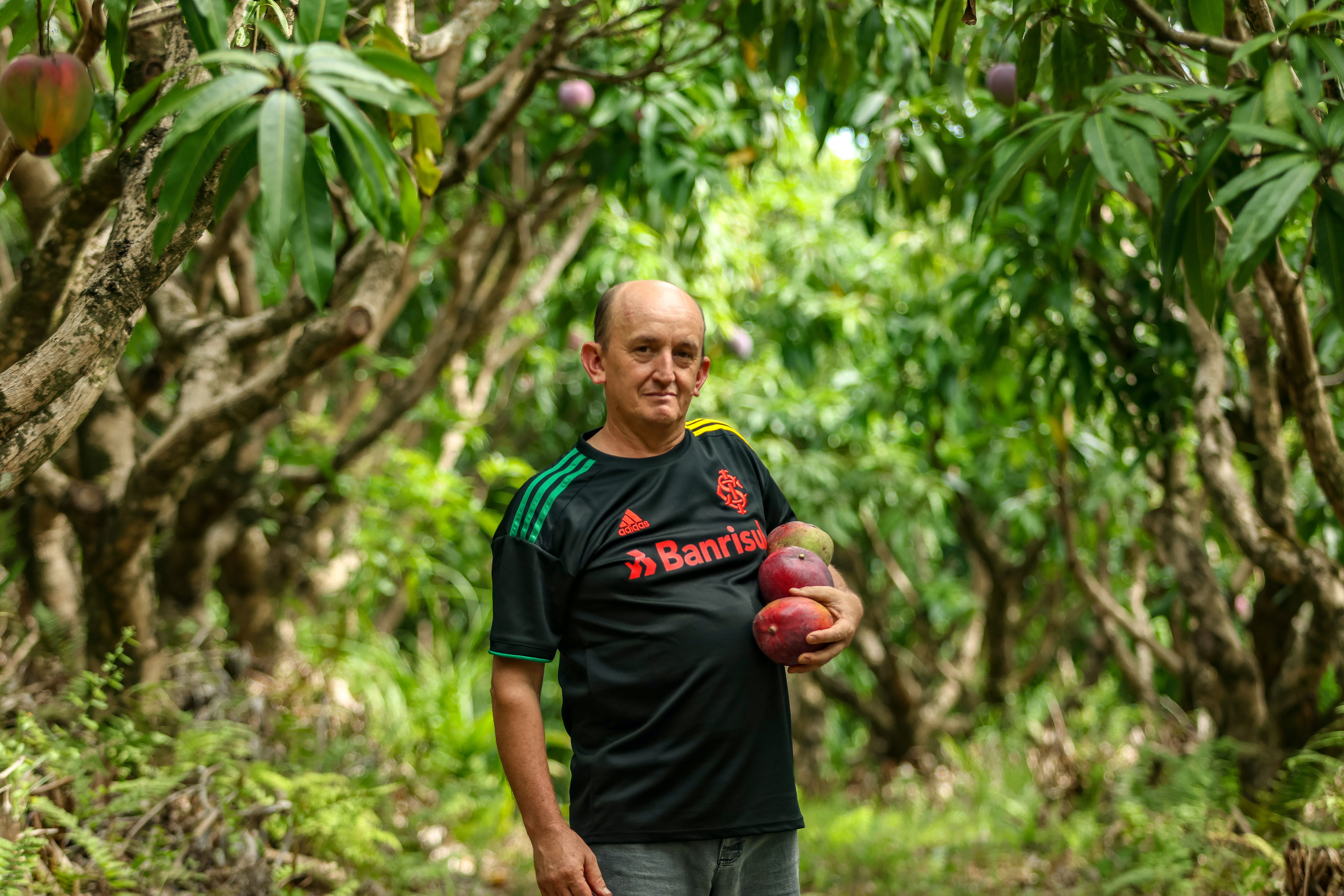 “A manga cai muito com o vento, e a árvore nativa protege. Com esse sistema mais aberto, ela amadurece mais cedo, pois tem mais sol. Automaticamente, sofre um pouco mais com o calor e fica com mais coloração, enquanto as outras são mais verdes”, explica. “E tem a questão de manter onde há muita vegetação e galhos. Vou manejando, as árvores nativas formam matéria orgânica e trazem nutrientes das camadas mais baixas do solo.”
